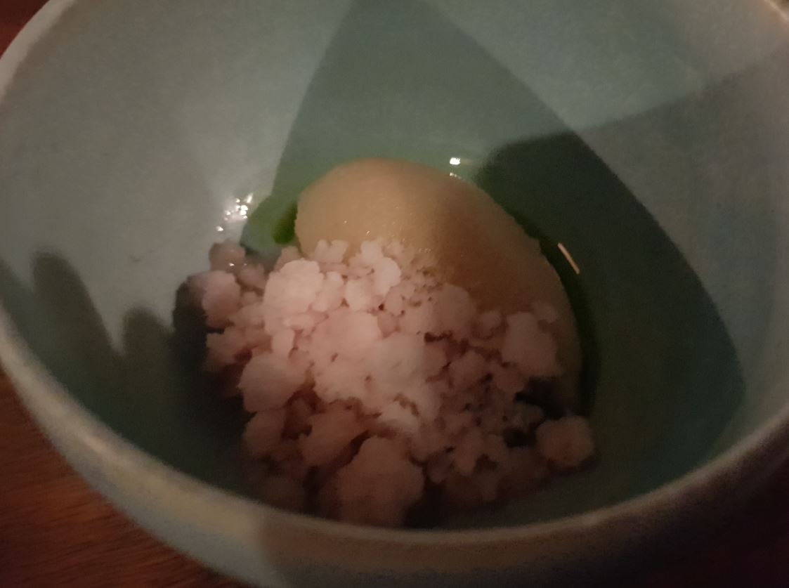 Shiromi (white fish), sushi rice, nori (seaweed), garum (Roman fish sauce) and sesame – this is the dish that we’ll be talking about for years to come. It doesn’t look much but oh boy it delivered on umami, umami tenfold! Such amazing savoury, moreish flavours with beautiful fresh fish hidden inside. I could have eaten ten of these little bowls of goodness: