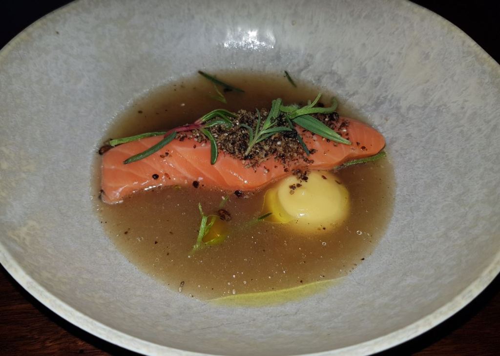 We decided to stick with the main degustation, no additions and were delighted with the amuse bouche selection of salted orange soda, spicy togorashi popcorn and pickled daikon. The popcorn was addictive and has inspired me to make some spicy popcorn at home. The menu has a Japanese twist, and we knew that we were in for a treat.