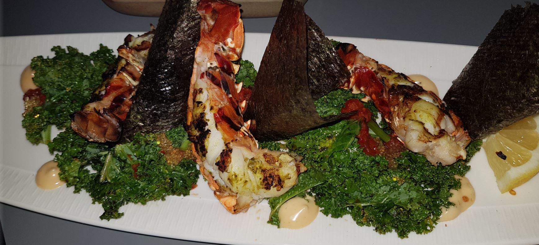 To start we couldn’t go past the lobster tails and chose them along with capelin with slaw. The lobster was a do-it-yourself nori sushi wrap. The dressing on the kale was tasty, a little on the salty side, but very nice with everything else together. The lobster was maybe a little overcooked, but not enough to spoil the experience.