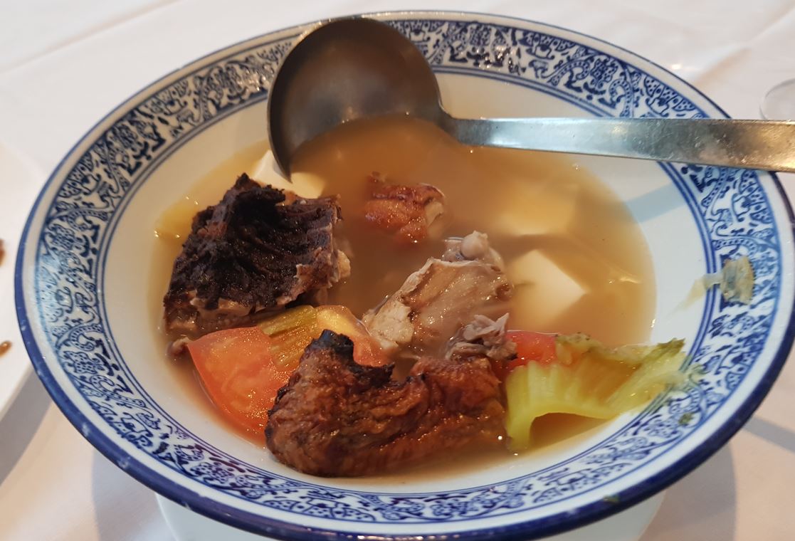 The third course was served by the waiter, a generous large bowl of duck bone soup with tomatoes, tofu and veggies. The rest of the soup was left for us to serve ourselves, and as we left it to infuse, the broth became richer and tastier. This amounted to around three individual bowls of soup each.