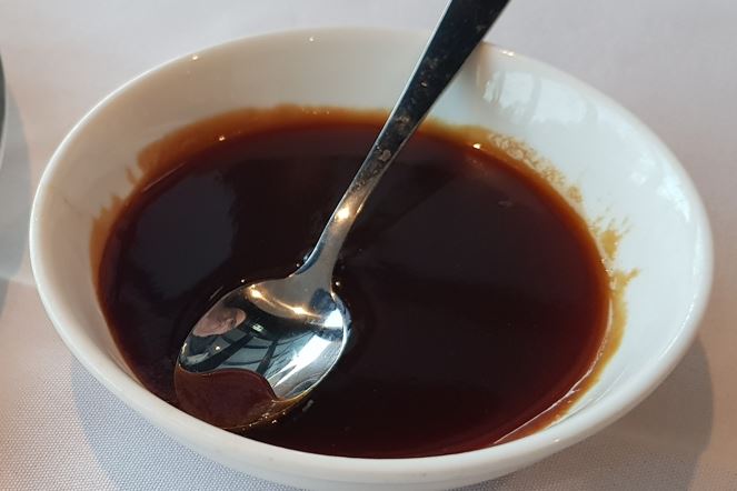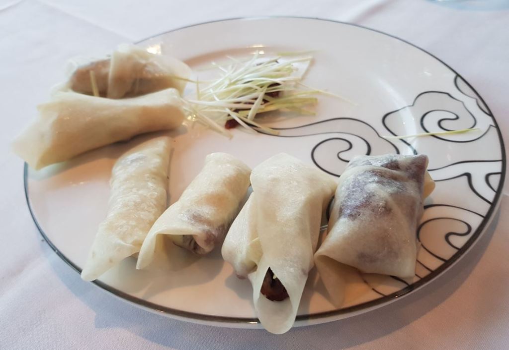 The duck arrived on a trolley and the waiter carved the duck and duck skin, and made pancakes in front of us with chilli, cucumber, and spring onions. We were presented with the plate of pancakes and some hoisin to dip them in. They were absolutely delicious.