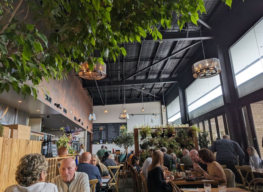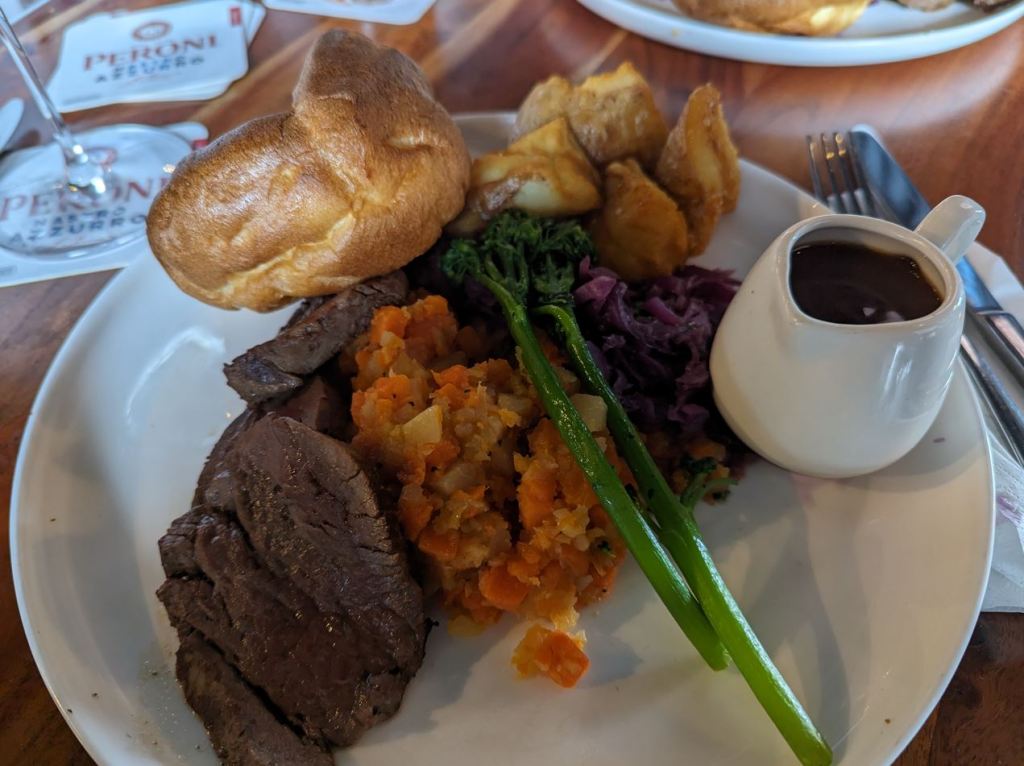 That’s pretty much where the waitress service ended. We had the choice of ordering online via a QR code or going up to the bar. The choices for Sunday lunch are roast beef, a chicken maryland, or a nut roast. I went up and ordered drinks and two portions of roast beef with trimmings ($38 for each roast). It was a bit confusing because the tables have a number, but you also get given a separate number to put on top of the table,