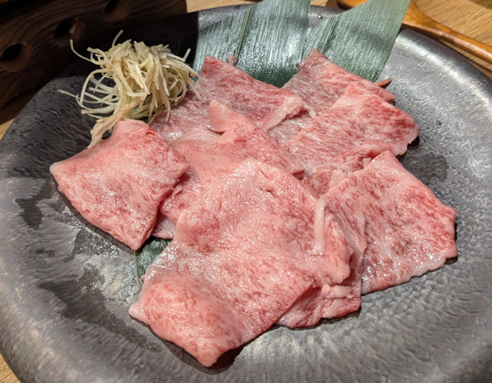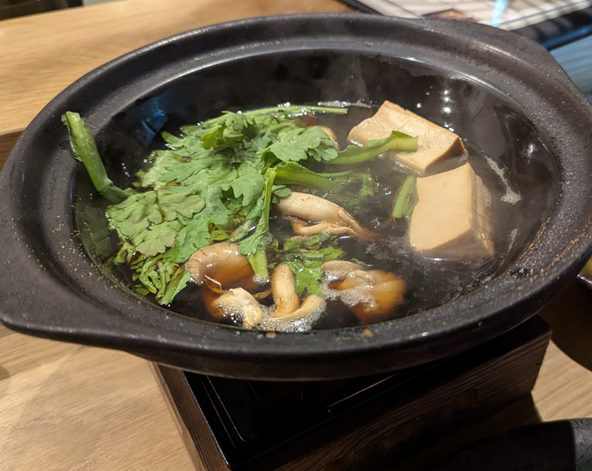 Next came sukiyaki, another new dish to me that was reminiscent of a steamboat in other cultures. We had a burner placed in front of us with a very hot clay pot of broth, tofu, greens and mushrooms. We were given a plate of premium wagyu with some extra chopsticks for the raw meat, and instructions to dip the meat in the broth for ten seconds then dip it in the rich egg yolk sauce. We followed the instructions and also drank the broth and ingredients with our ladles. The meat was incredibly good and the egg yolk sauce very special.