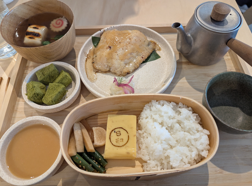 On our first visit we chose the miso cod. Great good quality cod with a delicious miso sauce. The soup had a chewy dumpling which made for an interesting texture, the egg was smooth and tasty and the pickles wonderful. Mochi dessert was green tea, which had a slightly bitter coating and a slightly sweet soft jelly texture. The sencha tea was first class.
