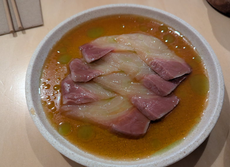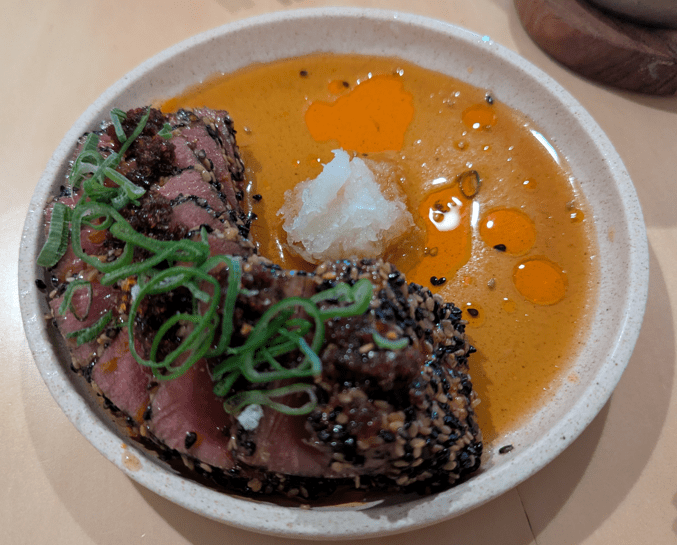 Then tuna tataki with a lovely chilli oil ponzu sauce and grated radish.
