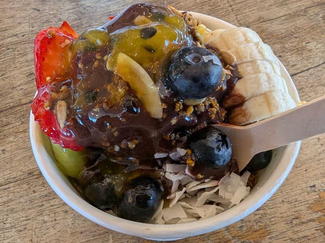 The Yelo version is very tasty, but the granola at the bottom is quite sweet and in clusters, and the acai is a thick, frozen sorbet. The assortment of fruits is nice – kiwi fruit, banana, strawberries, blueberries, passionfruit, along with some coconut shreds. It’s also dairy free, which is really important for me,